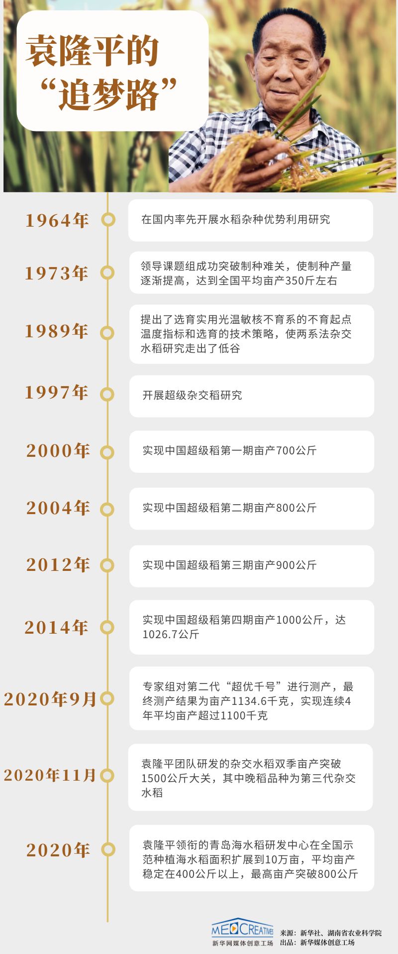 “杂交水稻是我毕生追求的事业,50多年来我一直心怀两个梦想,一个是‘禾下乘凉梦’,就是要选育出高产、更高产的杂交水稻,让中国人的饭碗牢牢端在自己手里;另一个就是‘杂交水稻覆盖全球梦’,将杂交水稻推广到世界上其他国家和地区,造福更多的老百姓。”