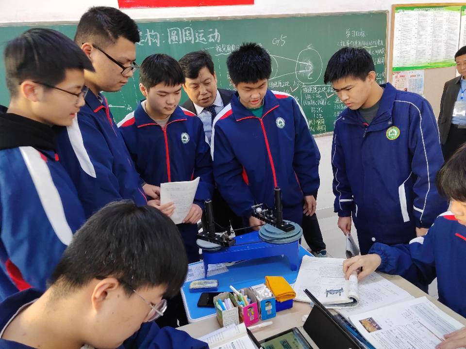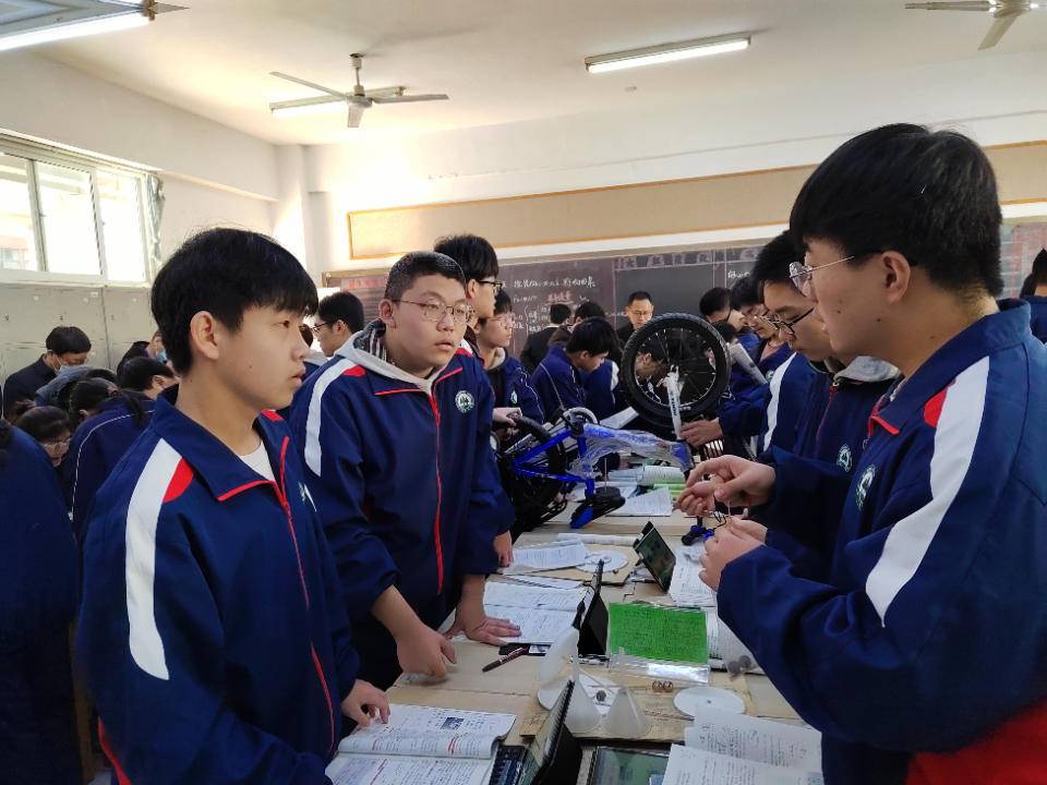 “物理是一门观察和实验为基础的科学,作为物理教师,我们自制教具的情形非常多。”潍坊实验中学物理教师金城告诉记者,“这次我们学习圆周运动这一单元,我们把四辆自行车搬进课堂,有同事从家里推来的代步工具,有同事家的儿童自行车。并增加了六种自制教具,我和同事们用一个下午和一个晚上的时间,三四个人共同完成的,加上材料准备,大概七八个小时,尽管用时比较长,但是效果非常明显。同一个单元,我们还把课堂放到过操场,让孩子们骑行体验。”