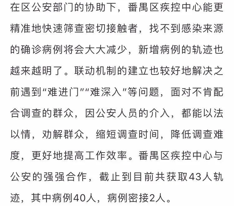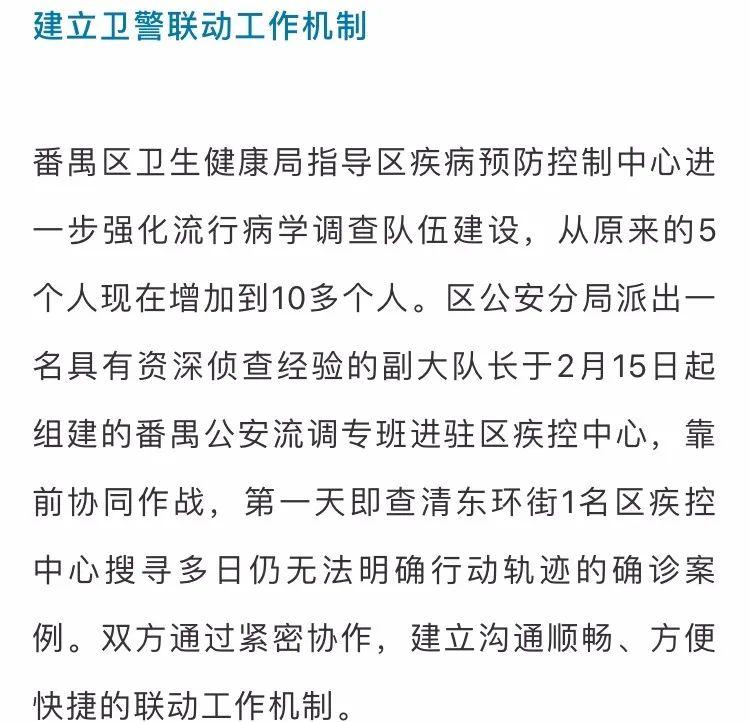 公安流调转班通过对番禺病例之间的活动还原,发现孔某在1月20日与某市场确诊病例郭某存在时空交集,通过再次补充调查,深入分析了孔某的消费行为,帮助孔某回忆到1月20日在东城市场的鱼档买过鱼,而某市场鱼档的档主郭某刚好于1月20日发病,孔某在1月20日与郭某接触后,1月26日发病,随后将病毒传给卢某,卢某于2月1日发病;