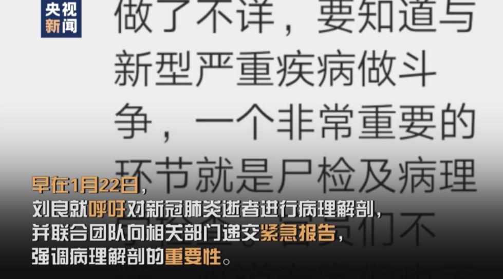 刘良:目的就是要搞清楚这个病毒伤害了病人的什么地方,我们叫靶器官。第一,我们可以探讨它的传播途径。第二,我们要针对这个地方,研究用药。还有就是弄明白这个病毒是通过什么机制让肺受到损伤的。如果找准的话,就可以针对性地采取保护性措施。没有尸体解剖的话,基本上就搞不清楚对手,也搞不清楚它打击你的方向,整个是茫然的。