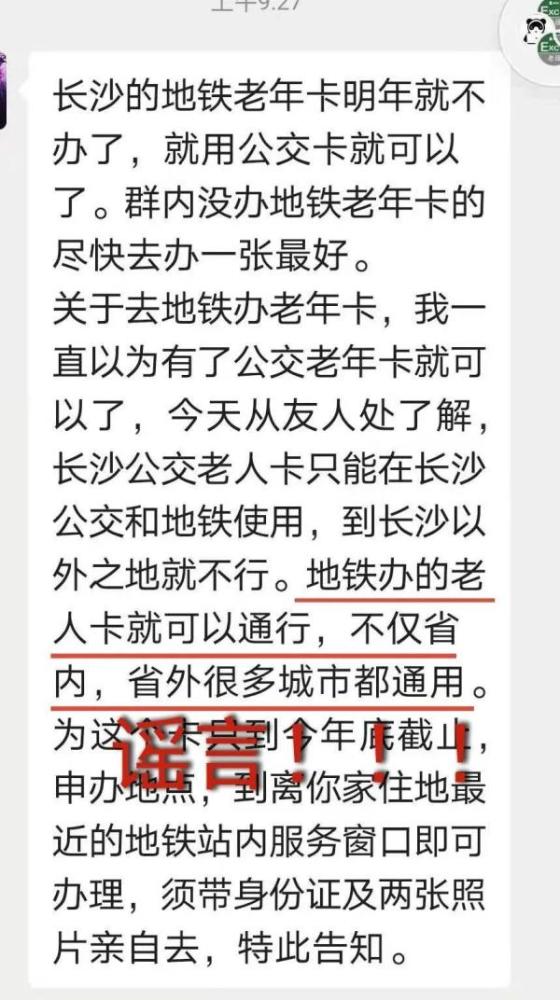 对此,长沙地铁严正辟谣:“长沙地铁老人卡在省内、外均通用”属不实消息!目前长沙地铁老人卡仅能在长沙地区范围内的地铁、公交使用,且持长沙公交老人卡及老年人优待证、身份证的年满65周岁老年人均可免费乘坐长沙地铁(持证老人需经车站绿色通道通行)。请广大市民切勿信谣传谣,尤其请老年朋友们不要冒着严寒天气前往车站扎堆办卡,注意出行安全。
