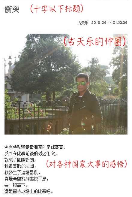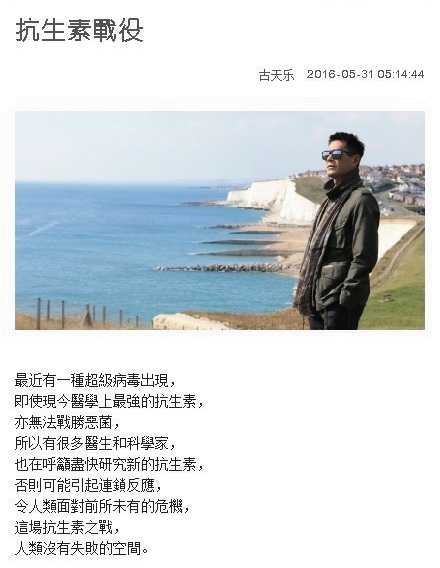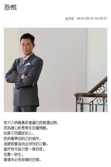 我觉得,看古天乐的博客,就像看CCTV的新闻联播,每天在那上面,都是各种国家大事,涉及领域包括证治、体育、经济、环保……