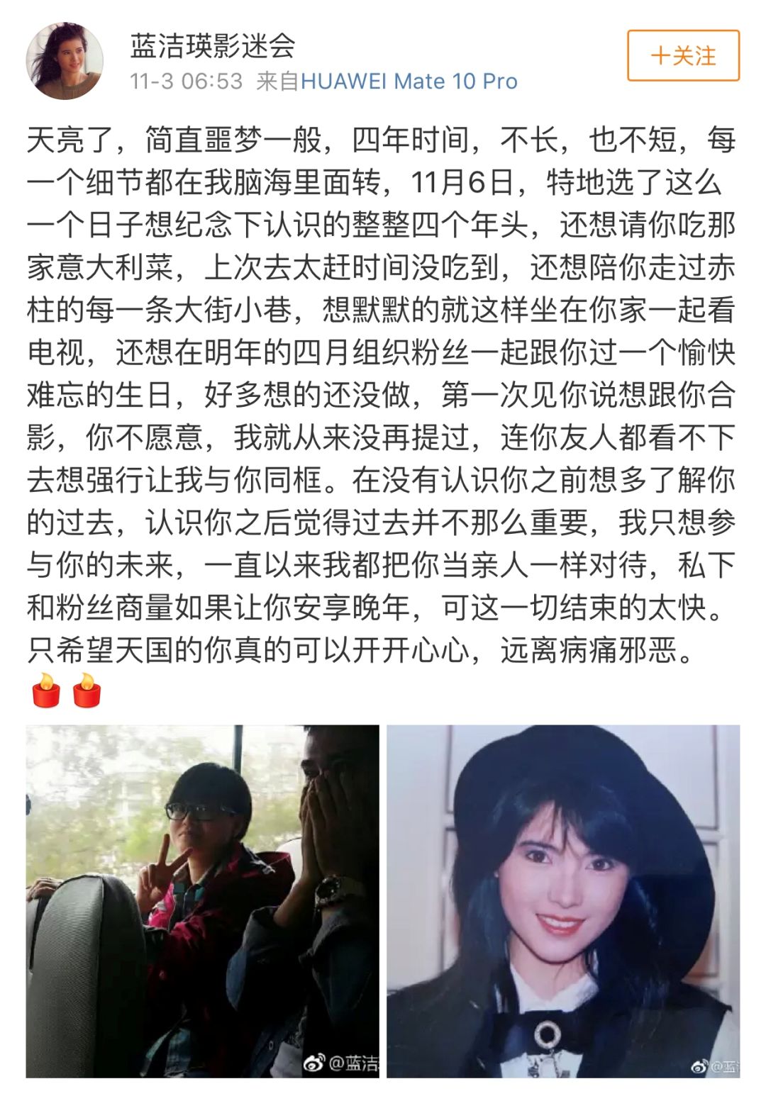 在内地微博上,@蓝洁瑛影迷会已发文悼念蓝洁瑛,并称“不是据传,就是事实,走得很安详”。