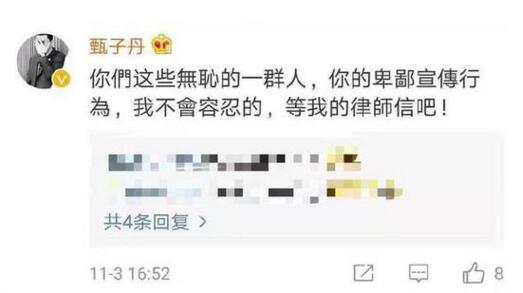 不过随后,甄子丹在微博下方回复:“你们这些无耻的一群人,你的卑鄙宣传行为,我不会容忍的,等我的律师信吧!”