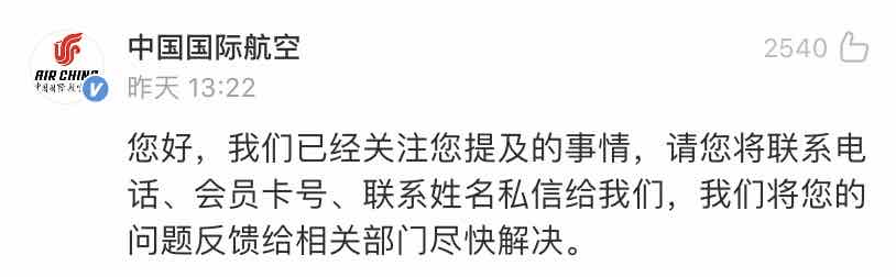 中国国际航空官方微博随后在江映蓉的微博下回复,称已关注到此事,将反馈给相关部门尽快解决。