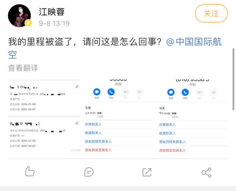 而在9月8日下午,歌手江映蓉在微博上晒出一张打码的身份信息截图及联系电话截图,透露自己的里程被盗,同时发文询问航空公司:“我的里程被盗了,请问这是怎么回事?”