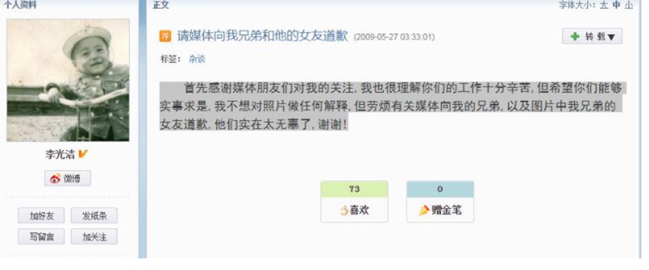之后李光洁在网上进行了很长时间的澄清,其实照片是因为拍摄角度的原因,看上去就好像是两个人在牵手一样,但其实是因为中间有一个塑料袋遮挡着两个人的手,造成了牵手在一起的错觉,李光洁表示照片中,是他的好兄弟以及兄弟的女友,以及请放过这只塑料袋。