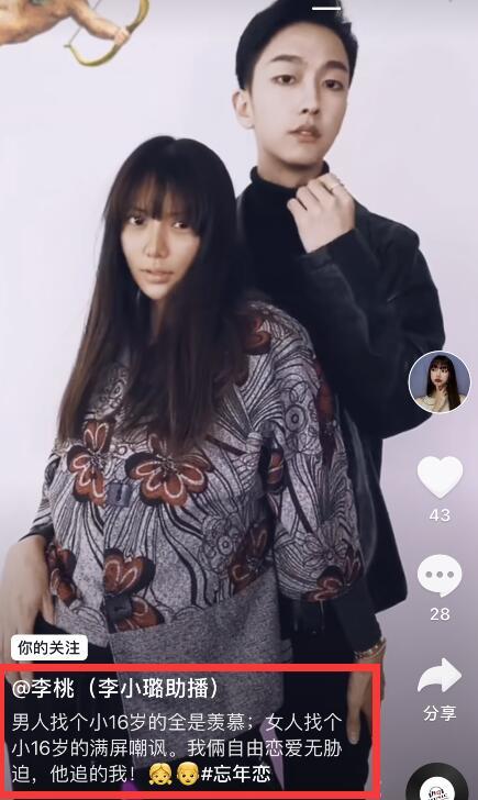 10月21日,李桃晒出了一个自己和男友在一起的视频,10月22日晚上,她再次晒出了自己与男友秀恩爱的一段视频。不仅如此,她还搭配文章表示:男人找个小16岁的女朋友,迎来的是大家的羡慕,而女人找个比自己小16岁的男朋友,则会迎来大家的嘲讽。但是自己与男友之间的恋爱是自主自愿的,而且还是男方追的自己。最后她还附上了忘年恋三个字。